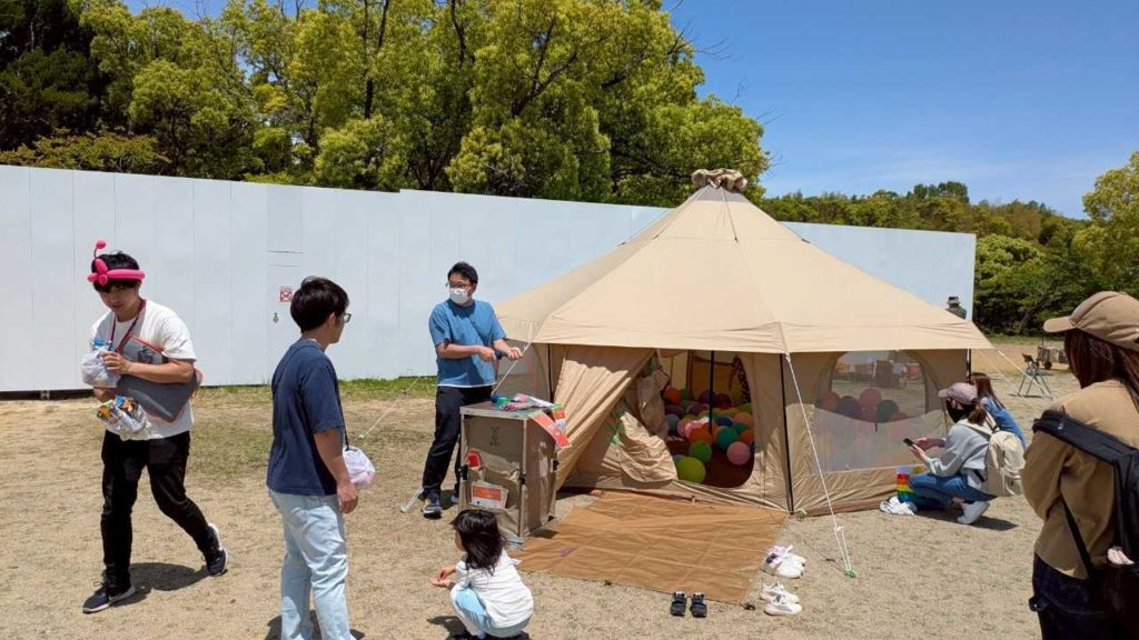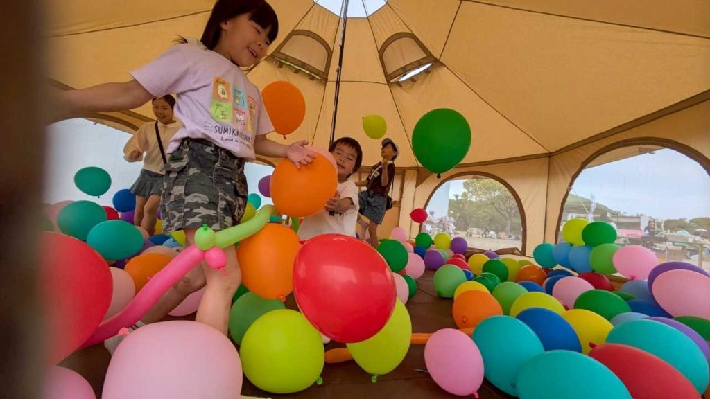 大型テントの中に、カラフルな風船いっぱいの秘密基地が出現します!